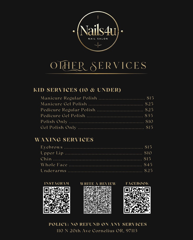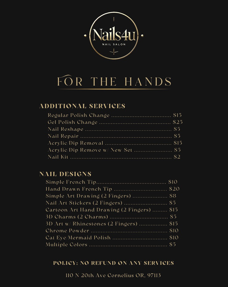 Nails 4 U - Your one-stop destination for all your nail care needs. From gel polish to nail art and extensions, we offer a wide range of services to cater to your every desire. Quality is our top priority, ensuring you leave with beautiful, long-lasting nails.